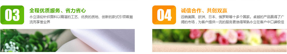 公司成立于1997年,坐落于風景秀麗的虞山腳下,位于中國經(jīng)濟最活躍的版圖--長江三角洲經(jīng)濟技術(shù)開發(fā)區(qū)的黃金地段上,常熟市永立針紡織有限公司,伴隨著中國針紡織品行業(yè)蓬勃發(fā)展,走過了10多年的創(chuàng)業(yè)歷程,如今已發(fā)展成為一家集工、貿(mào)于一身,在行業(yè)內(nèi)聞名遐邇的專業(yè)生產(chǎn)滌綸針織面料的特色企業(yè)。本公司擁有來自臺灣的先進制造設備,以雙面小提花機為主的34寸(16--45針)雙面緯編機50臺、34寸(20--50針)單面開幅機9臺、36寸 22針德國邁耶OVJE雙面電腦大提花機6臺及其他先進設備。憑借著一流的設備,以及“人無我有,人有我好,人好我轉(zhuǎn)”的經(jīng)營理念,常熟永立一直致力于滌綸面料的創(chuàng)新...